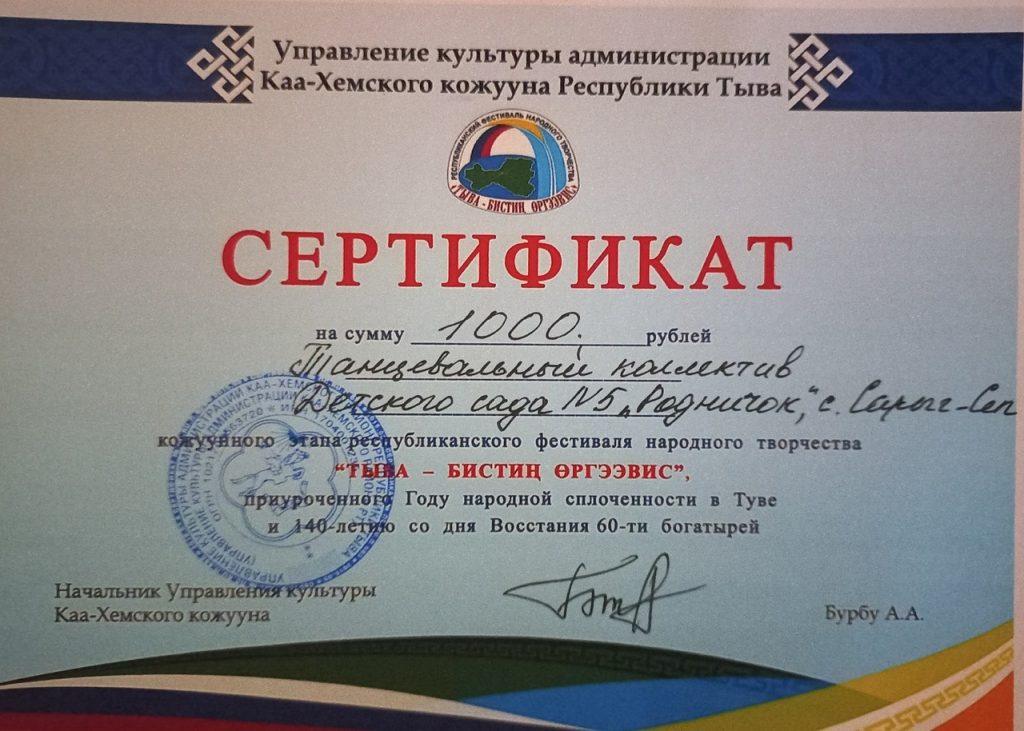 02.04.2023 года коллектив детского сада приняли участие в муниципальном этапе Республиканского фестиваля — конкурса народного творчества «Тыва — бистиң өргээвис», приуроченного Году народной сплочённости в Туве и 140-летию со дня Восстания 60-ти богатырей.