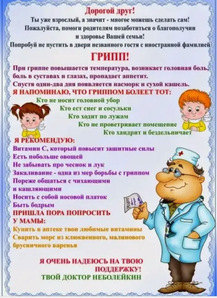 — Научить детей кашлять и чихать в салфетку или руку. Родители тоже должны выполнять эту процедуру, что послужит хорошим примером для детей. Научить детей не подходить к больным ближе, чем на полтора — два метра.