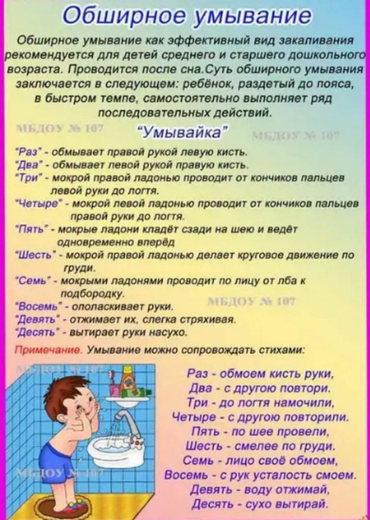Проведение закаливающих мероприятий (обливание ног водой комнатной температуры на ночь; для детей младшего возраста — пребывание без одежды в условиях комнатной температуры при отсутствии сквозняков в течение нескольких минут перед кормлением)