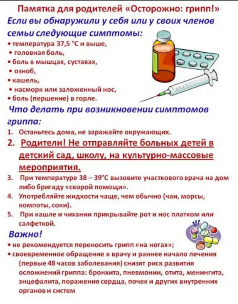 В случае всех перечисленных выше симптомов у ребёнка: повышение температуры тела, кашель, боль в горле, озноб, головная боль, затруднённое дыхание, боли в мышцах и суставах, сыпь, рвота, понос родители обязуются незамедлительно обратиться к помощи врача.